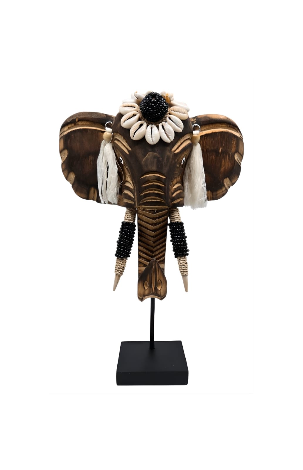 Apportez une touche bohème et exotique à votre intérieur avec ce magnifique éléphant décoratif en bois, sculpté à la main et délicatement orné de coquillages et de perles naturelles.
