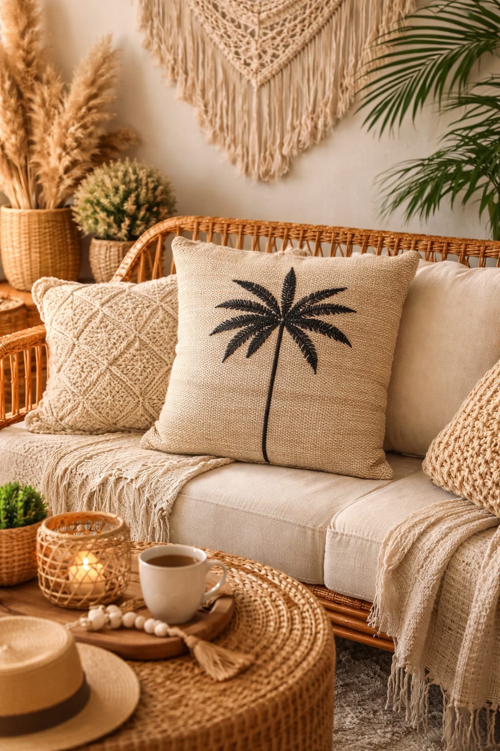 Apportez une touche de fraîcheur tropicale à votre intérieur avec ce coussin fait main en provenance de Bali. Mesurant 40x40 cm, il est décoré d'un magnifique motif de palmier, délicatement brodé à la main. Son design naturel et sa couleur neutre s'harmonisent parfaitement avec une décoration bohème ou minimaliste.