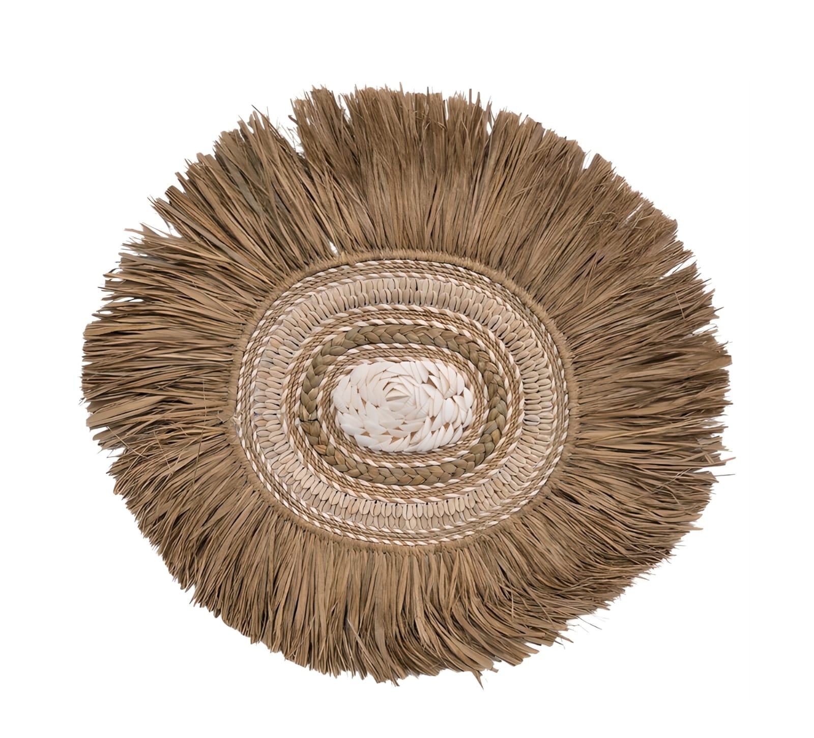 Apportez une touche bohème et ethnique à votre intérieur avec ce Juju Hat mural en raphia et coquillages. Entièrement fait main, il associe fibres naturelles et détails délicats pour une décoration murale chaleureuse et authentique.