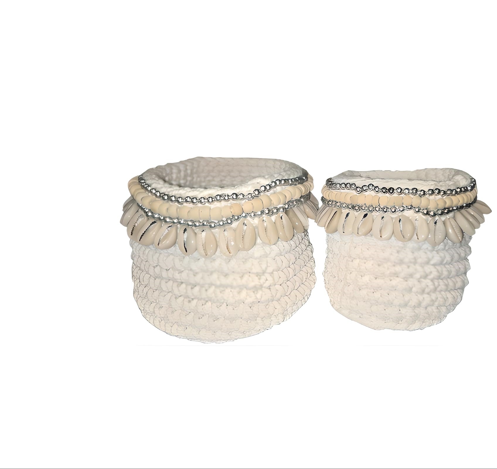 Apportez une touche artisanale et bohème à votre déco avec ce joli set de paniers en crochet blanc , délicatement ornés de perles et de cauris. Parfaits pour ranger vos bijoux, petits accessoires ou simplement décorer avec charme.