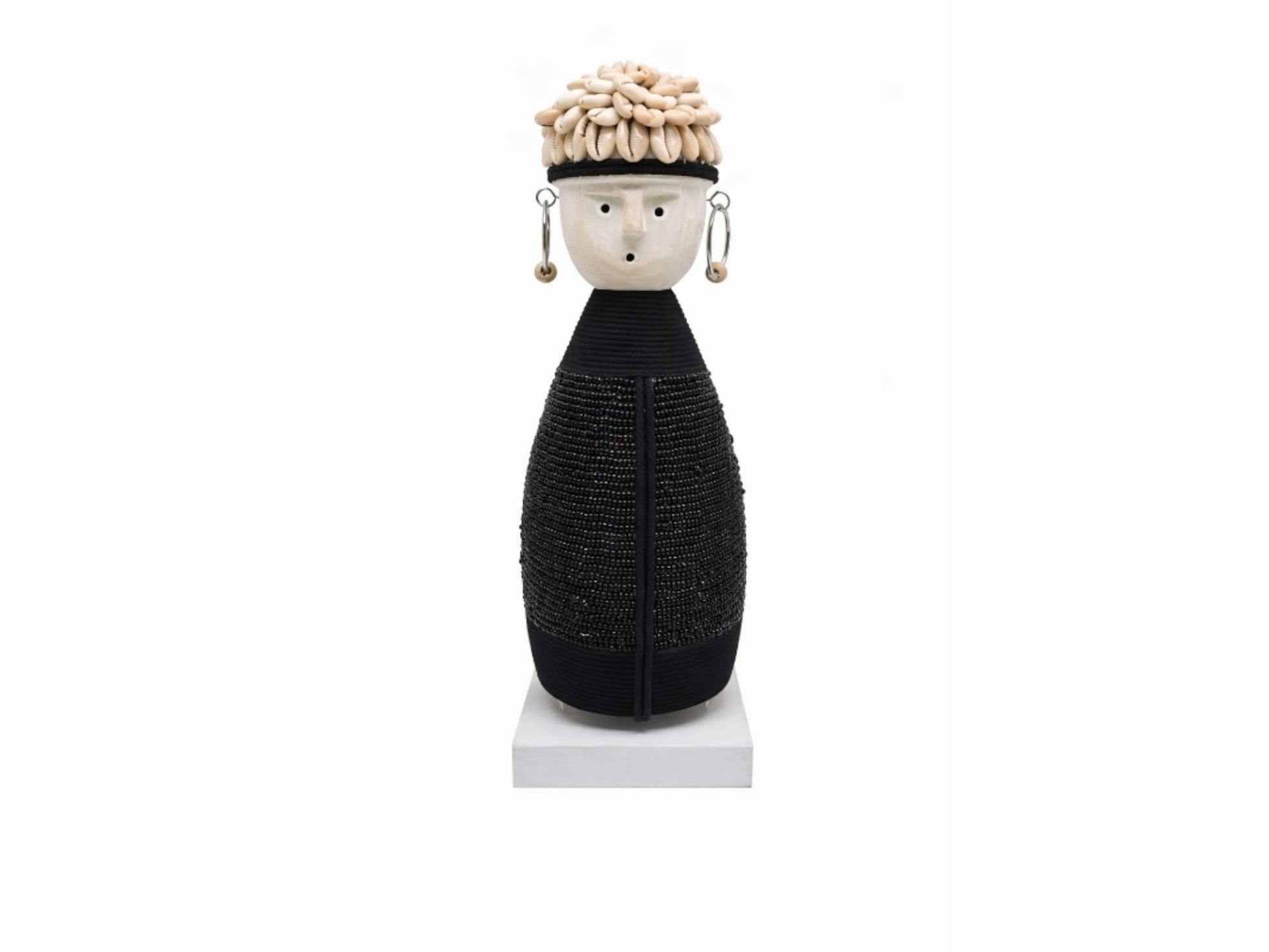 Sublimez votre intérieur avec cette statue Namji artisanale, sculptée en bois et ornée de perles et coquillages.