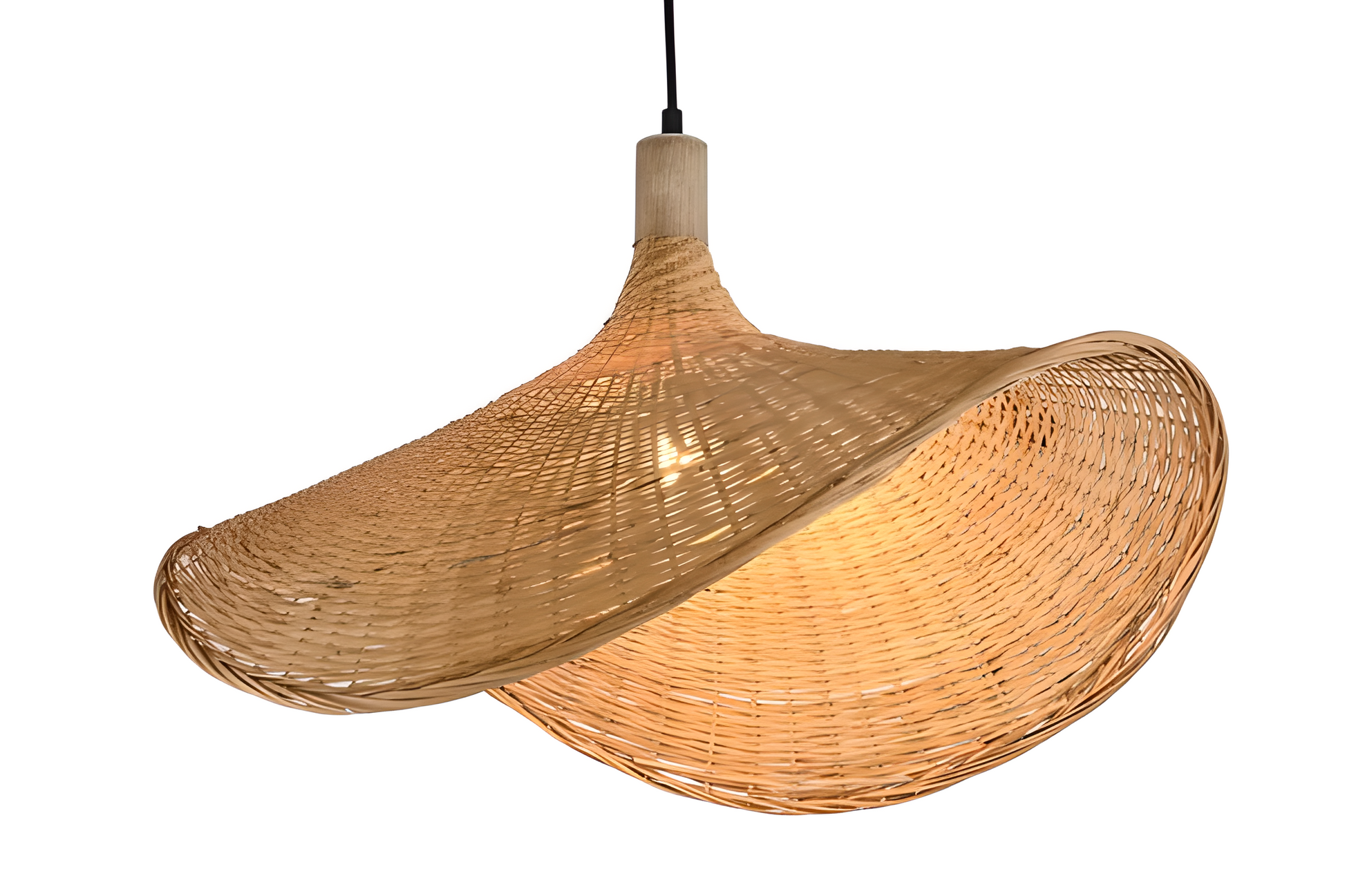 Apportez charme et authenticité à votre intérieur avec cette suspension en rotin naturel, inspirée de la forme d’un chapeau traditionnel. Son tressage délicat et sa silhouette aérienne diffusent une lumière douce et tamisée, idéale pour une ambiance bohème et chaleureuse.