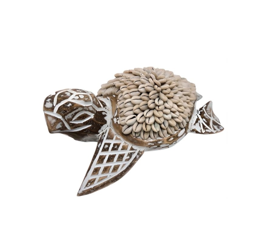Tortue décorative en bois marron & coquillages – Fait main à Bali