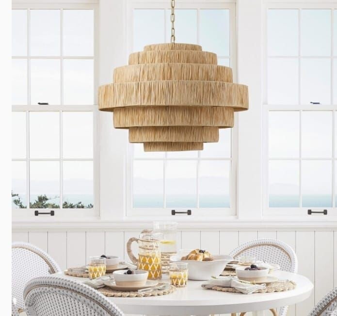 Entièrement tressée à la main, elle se distingue par son design aéré et superposé, créant une lumière douce et chaleureuse à travers ses couches de raphia naturel.