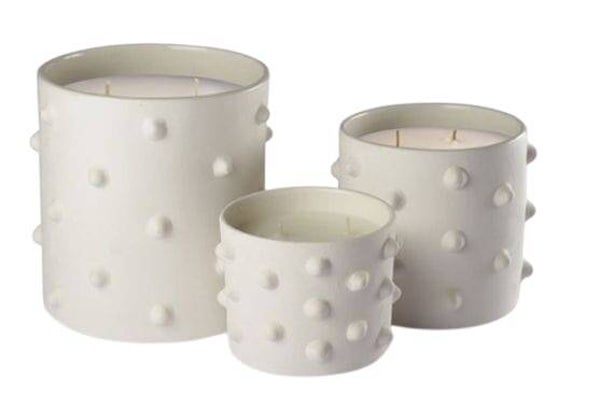 Cette bougie en céramique blanche, façonnée à la main au Maroc, séduit par sa forme et son élégant décor de petites boules sculptées tout autour. Chaque pièce est unique, et peut présenter de légères irrégularités liées à sa fabrication artisanale, ce qui lui donne tout son caractère.