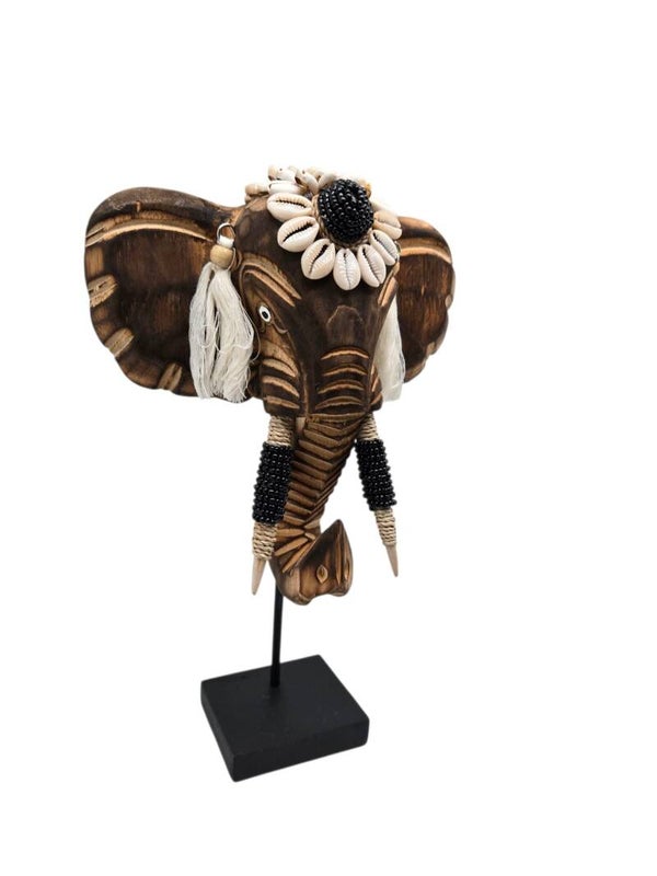 Élégant éléphant sculpté à la main et orné de coquillages et perles. Une pièce artisanale unique qui apporte une touche bohème et exotique à votre intérieur.